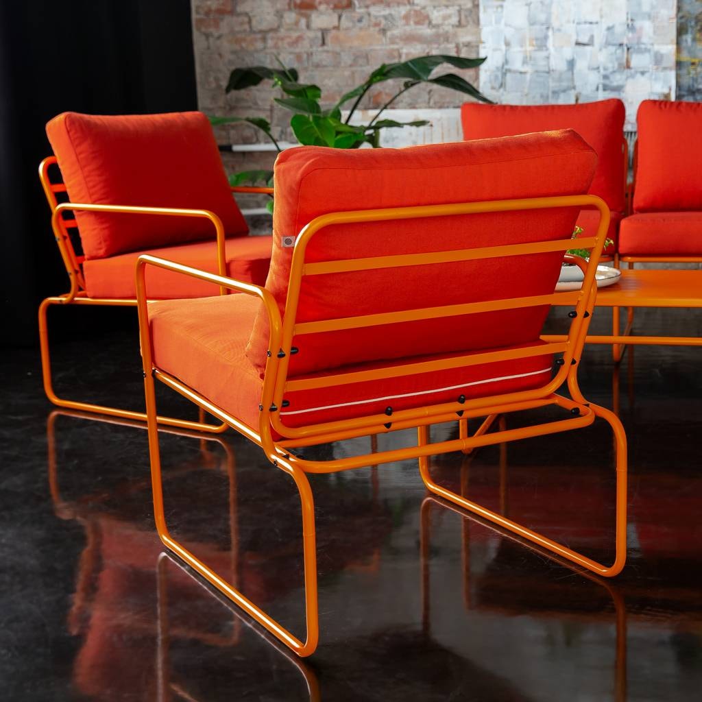 Nefryt je jedinečná sada zahradního nábytku pro venkovní i vnitřní použití. Tento stylový set obsahuje dvě křesla, dvoumístnou pohovku a nízký konferenční stolek s malými otvory uprostřed ocelové desky, což mu dodává moderní charakter. Otvory v desce stolu jsou navrženy tak, aby umožňovaly snadný odtok dešťové vody, což zajišťuje, že deska stolu zůstane čistá a rychle schne. Komplexní ochrana proti vnějším faktorům, jako je UV záření a vlhkost, je zajištěna použitím práškově lakované oceli v celé konstrukci nábytku, včetně rámů a desky stolu.