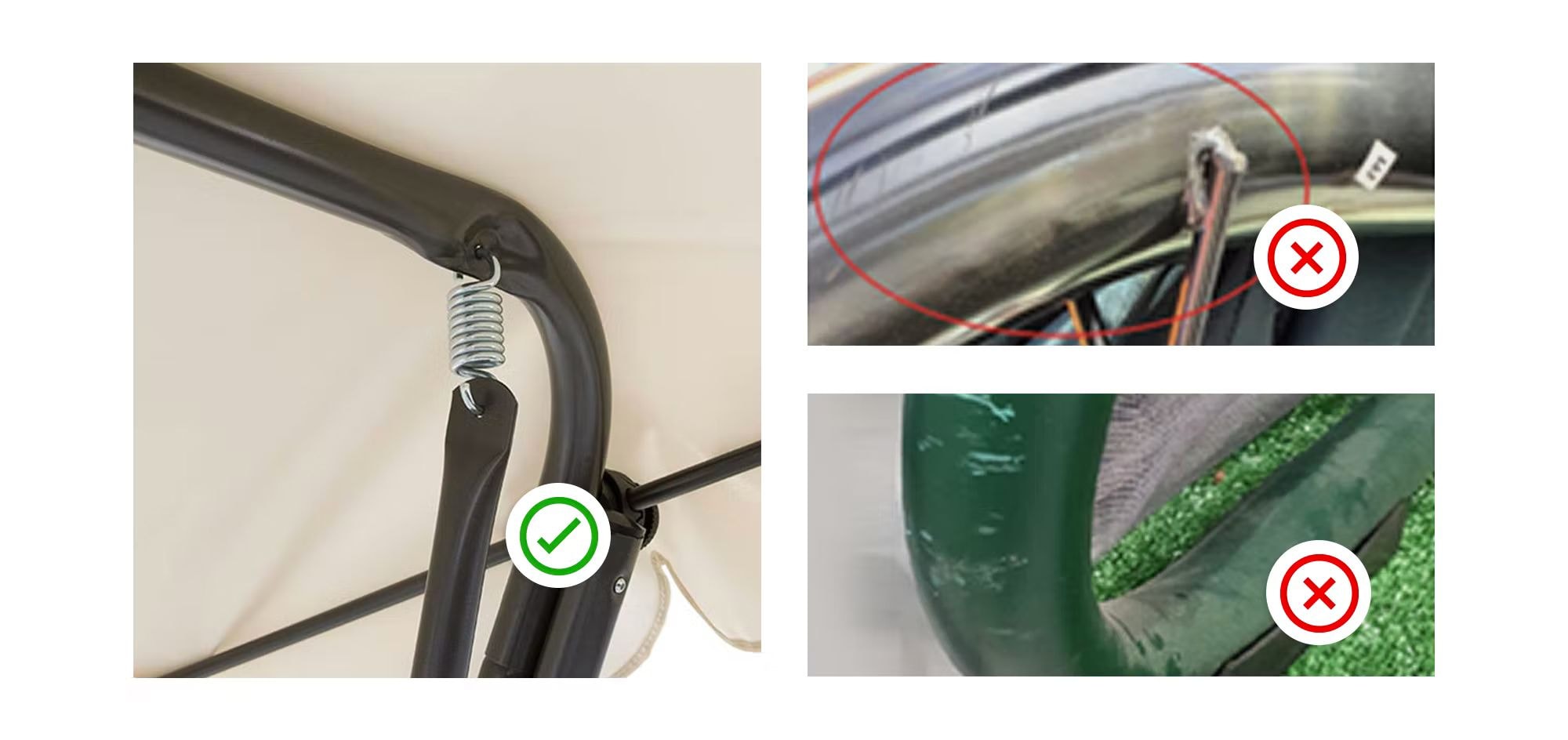 Mimořádně důležitá pro trvanlivost zahradní houpačky jsou místa spojení různých prvků. Každý z prvků v našich produktech je řádně pozinkován. To chrání před vnějšími povětrnostními vlivy. Ve šroubových spojích používáme plastové podložky (nekovové) a ostré konce zakrýváme příslušnými krytkami. Použití řešení, kde spolu spolupracují lakované a kovové prvky, vede v krátké době k oděru barvy v místě takového spoje. Důsledkem jsou pak další ložiska rzi.