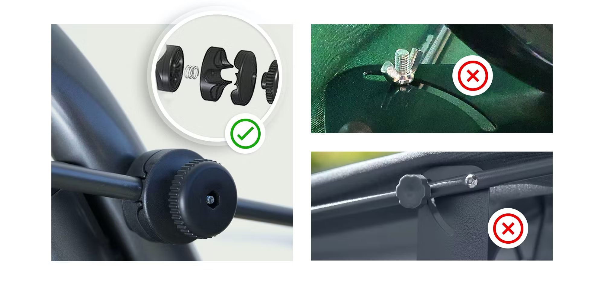Ceníte si pohodlí a funkčnosti? Naše řešení umožňují libovolné nastavení úhlu sklonu, i když pohodlně sedíte a odpočíváte. Tuto možnost poskytuje speciální pružinová spojka použitá v našich konstrukcích. Díky ní můžete stříšku snadno zaaretovat v požadované poloze. Tento dokonale propracovaný malý prvek dodává pocit ještě většího komfortu a užitné hodnoty vaší houpačky. V mnoha případech se bohužel používají nedotažená, zjednodušená a levná řešení. Ta způsobují mnoho potíží při nastavování kvůli nepohodlným malým knoflíkům a nutnosti neustále korigovat nastavení i při mírném poryvu větru.