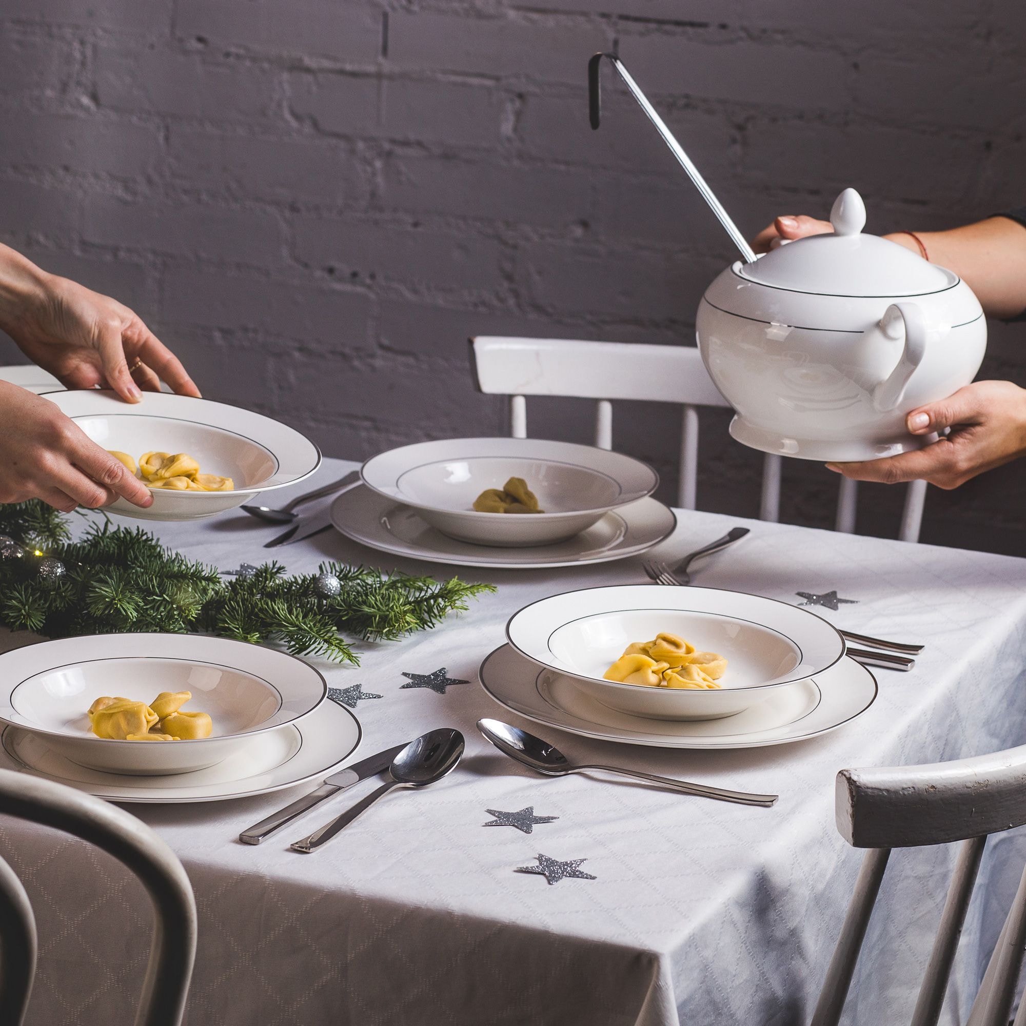 Základem vydařeného aranžmá štědrovečerního stolu je elegance, harmonie a nadčasový styl. Právě stolní nádobí do značné míry vytváří atmosféru tohoto výjimečného večera, proto se vyplatí vsadit na osvědčená, klasická řešení. Nejlépe vypadá bílý porcelán, který je již léta synonymem vytříbenosti a vánoční tradice. Jeho jemný lesk krásně odráží světlo svíček a vánočních světýlek a čisté barevné provedení podtrhuje barvy pokrmů, od červeného boršče až po dozlatova upečené pirohy.