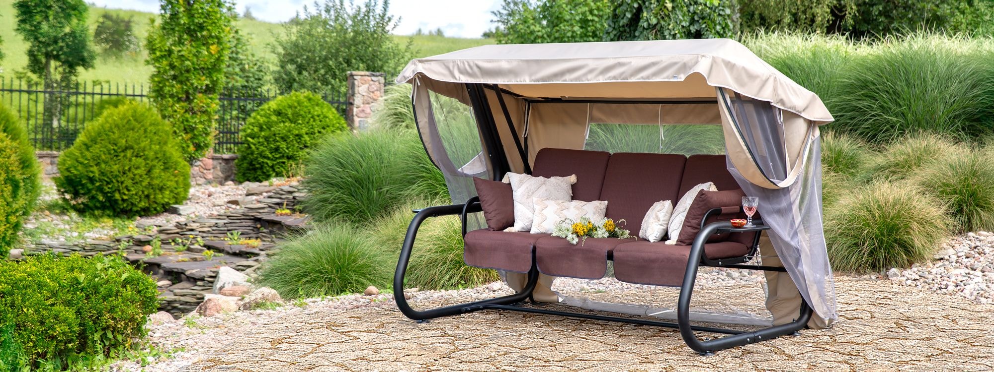 Houpačka v boho stylu na ocelovém rámu je moderní interpretací klasického designu, která spojuje komfort s funkčností. Solidní ocelová konstrukce, měkké polštáře v barvách země a stylová stříška s moskytiérou je kombinace, díky které houpačka vypadá výjimečně lehce, a přitom je stabilní a odolná.