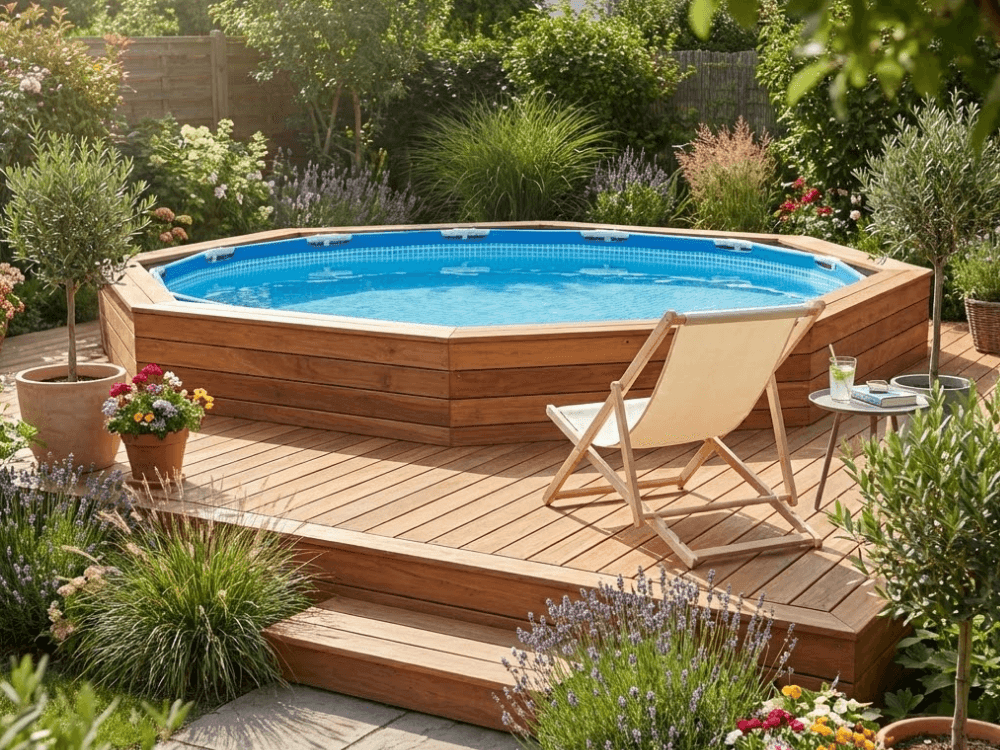Nadzemní bazén je nejlepší obložit dřevem, WPC kompozitem, technorattanem nebo modulárními panely. Pro nízkorozpočtovou variantu se osvědčí solidně upravené palety, aby se spojila estetika, funkčnost a bezpečnost popsaná v článku.