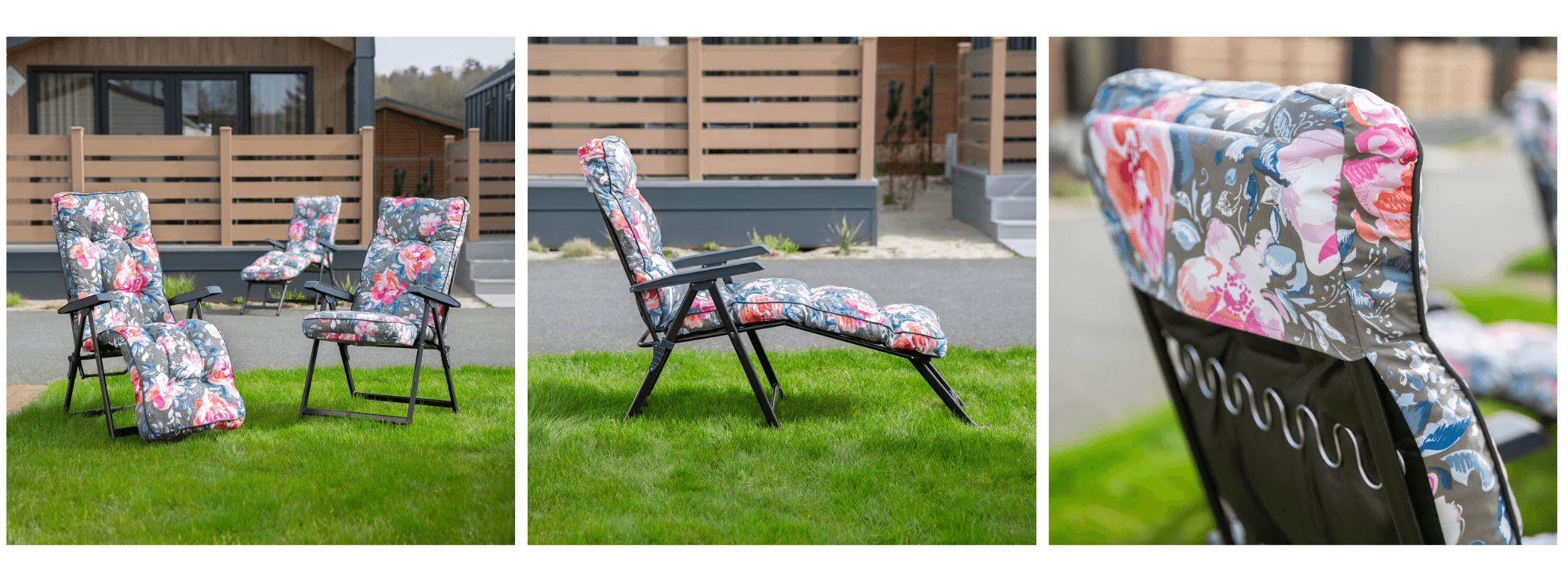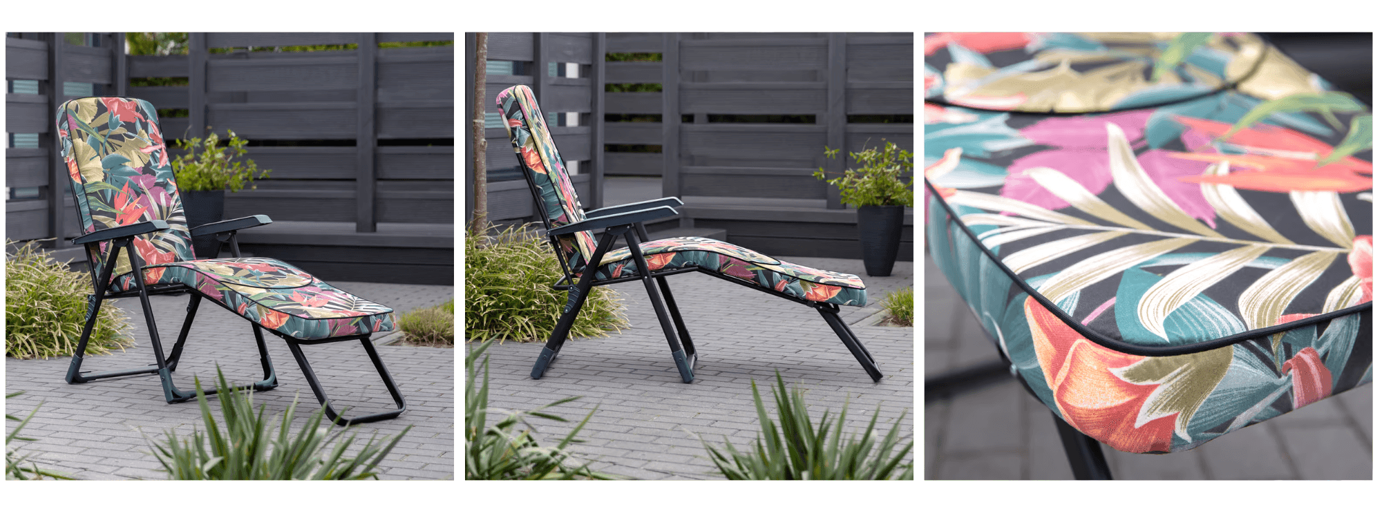 Rozlišovacím znakem modelu Modena je však design polstru a barevné provedení. Standardní verze jsou často nabízeny v tlumených, jednotných barvách, např. šedý melír na polstru a tmavě šedý (antracitový) rám. Díky tomu lehátko vypadá velmi elegantně a moderně – spíše jako prvek módní terasy. K dispozici jsou také edice s potisky, např. geometrickými vzory ve skandinávském stylu nebo tropical (listy, květiny), ale v moderním barevném provedení (šedá, bílá, černá s akcenty). Samotný polstr u modelu Modena má tloušťku cca 7 cm (polyuretanová pěna) – je o něco tenčí než u modelu Lena, ale stále velmi komfortní. Jeho potah je rovněž směsí bavlny a polyesteru, obšitý lemem, s kapsou v horní části a gumovým páskem v dolní části pro upevnění. Celek vytváří ucelený, minimalistický vzhled – např. šedý materiál s šedým lemem vypadá moderněji než tradiční barevné provedení. Plastové područky jsou obvykle tmavé (černé nebo grafitové) a splývají se stylem celku.
