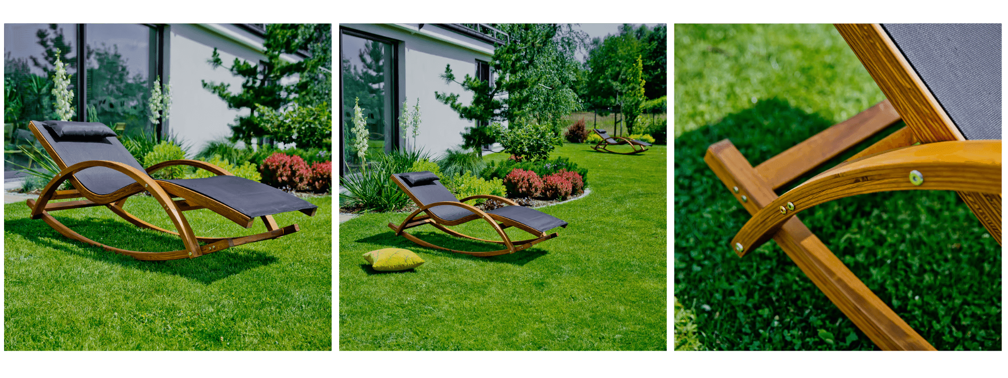 Zahradní houpací lehátko Larice je nabídkou pro ty, kteří oceňují přírodní materiály a houpavou relaxaci. Toto zahradní lehátko má formu stylového houpacího lehátka – svým tvarem připomíná tak trochu SPA lehátko kombinované s ližinami houpacího křesla. Jeho konstrukci tvoří pevný dřevěný rám z modřínového dřeva, jehož charakteristické, obloukovitě prohnuté nohy slouží zároveň jako houpací ližiny a područky. Výrobce použil vysoce kvalitní masivní modřín s povrchovou úpravou tungovým olejem v barvě teak a navíc celek nalakoval pro ochranu. Takové zabezpečení dřeva zdůrazňuje jeho kresbu letokruhů a dodává mu teplý, medově hnědý odstín a zároveň zvyšuje odolnost vůči povětrnostním vlivům (olej a lak chrání před vlhkostí, plísněmi a UV zářením). Přesto, jako každý dřevěný nábytek, Larice vyžaduje určitou péči pro udržení ve skvělé kondici. Rozměry lehátka jsou cca délka 165 cm, šířka 72–73 cm, výška 66–70 cm a hmotnost činí cca 17 kg. Jedná se tedy o těžší, masivní kus nábytku, který spíše zůstane trvale na zvoleném místě v zahradě či na terase, než aby byl často přenášen. Maximální zatížení Larice je 120 kg – o něco méně než u ocelových lehátek, ale stále dost na to, aby jej mohl pohodlně používat dospělý člověk. Pozornost upoutá absence typického nastavení opěradla – Larice není rozkládací ani polohovatelné, nabízí jednu fixní polohu v pololeže (optimálně zvolenou pro houpání). Nelze jej ani složit do plochého tvaru, protože celý rám je tuhý. Toto lehátko je nábytkem pro vlastní montáž – dodává se v prvcích k sešroubování, což je díky jasnému návodu poměrně jednoduché. Největším lákadlem Larice je funkce houpání. Speciálně profilované ližiny umožňují jemné houpání dopředu a dozadu, když na lehátku sedíte nebo ležíte. Je to neuvěřitelně uvolňující pocit – představte si zdřímnutí na čerstvém vzduchu s jemným houpáním jako v houpací síti. Rozsah houpání je přitom z bezpečnostních důvodů omezen konstrukcí, takže se nemusíte bát převrácení při příliš velkém rozhoupání. Sedák a opěradlo Larice nejsou vyrobeny z prken nebo silných polštářů, ale z elastické textilie (textilene) s vazbou 2×1. Jedná se o moderní syntetickou tkaninu (polyester potažený PVC), odolnou proti roztažení, vlhkosti a UV záření, a přitom zajišťující pružnost podobnou síťovině. U modelu Larice tento materiál pokrývá celou plochu pro ležení a je napnutý na rámu jako plátno lehátka – díky tomu se pohodlně přizpůsobí tělu a zároveň rychle schne a „dýchá“ (důležité v horku). V sadě najdeme také malý polštářek pod hlavu ze stejného materiálu, který se zapíná nebo upevňuje na opěradlo. Tato opěrka hlavy zvyšuje komfort odpočinku tím, že podpírá krk při ležení na zádech. Stojí za to dodat, že všechny dřevěné hrany jsou zaoblené a broušené, což zabraňuje zranění a svědčí o pečlivém zpracování.